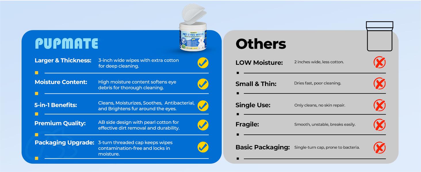 - WHY PUPMATE - Safe for all dogs and cats, free from alcohol, optical brighteners, and fragrance. MSDS certified and veterinarian recommended. Our tear stain wipes are dedicated to promoting healthier, happier lives for pets. If you have any questions or concerns, our customer service team is here to help and ensure your satisfaction